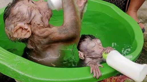 Обезьяник с братишкой купаются в тазике и с аппетитом кушают