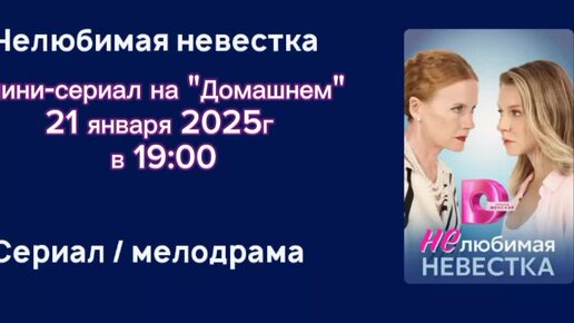 Минисериал "Нелюбимая невестка" 21 января 2025г на "Домашнем" в 19:00 с Татьяной Чердынцевой в главной роли lv_0_20250121204640