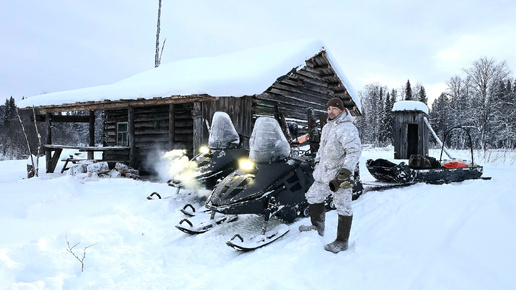 ЗАЕЗД В ТАЙГУ НА ДВУХ СНЕГОХОДАХ СМ-002. НОЧЕВКА В ИЗБЕ. РЫБАЛКА НА ХАРИУСА ПО ЛЬДУ ТАЕЖНОЙ РЕЧКИ.