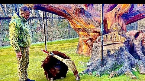 СМЕХ, да и только! Орангутан Дана веником подметает вольер!
