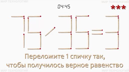 Переложите спичку, решив задачу 383 (4), исправив ошибку в предложенном выражении: 75 / 35 = 3