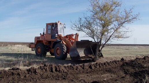 Шины "Satoya 20,5-25" на фронтальном погрузчике "Амкодор". Подготовка целины к пахоте. Корчевание дерева.