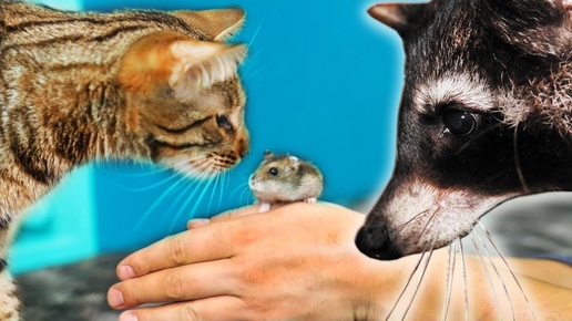 Как енот и кот принимали хомяка. Животных пробуют новые ягоды и игрушки, наблюдаем реакции