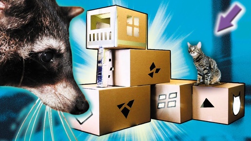 Как енот и кот отреагируют на трехэтажный домик. Реакция на жилплощадь из картонных коробок
