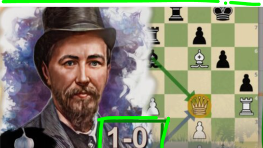 Джона Оуэна наказывают за примененную им за черных защиту Оуэна: Джозеф Блэкберн ударяет жертвой ферзя 20.♕xf7+ по колове (манчестер, 1890)