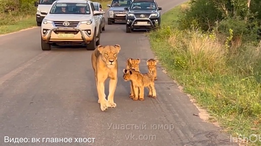 Грациозная львица и 4 ее малыша устроили настоящую подставу водителям на дороге!