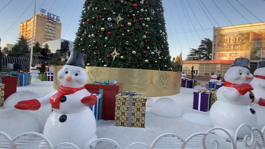 Сочи. На Навагинской еще стоит елка, цветут цветы. Погода отличная