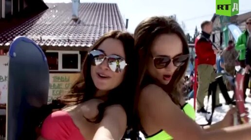Полуголые девушки и парни катаются на лыжах и сноубордах в России