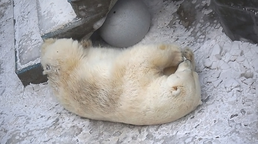 Белый медведь Кай позавтракал, поспал, проверил, что его любимый шар примерз и начал играть с канистрой.