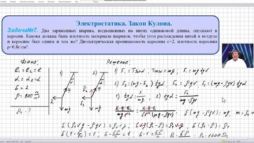 Физика10. ОК 045. Задача 7. Закон Кулона. Два заряженных шарика, подвешенных на нитях одинаковой длины, опускают в керосин. Какова ...