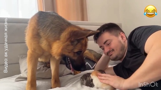 Немецкая овчарка приревновала хозяина к котятам!