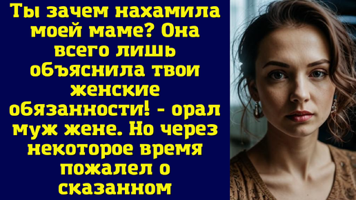 Ты зачем нахамила моей маме? Она всего лишь объяснила твои женские обязанности! - орал муж жене. Но через некоторое время