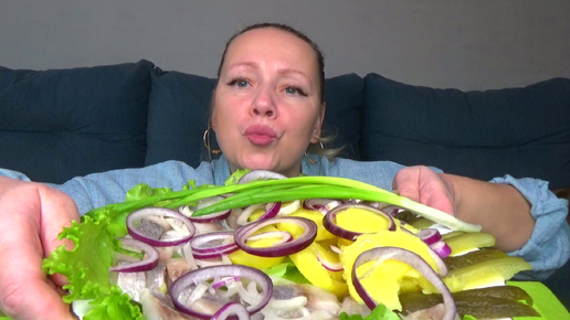 Мукбанг селедка с тремя видами лучка, картошка в мундирах, огурцы бочковые. еда.