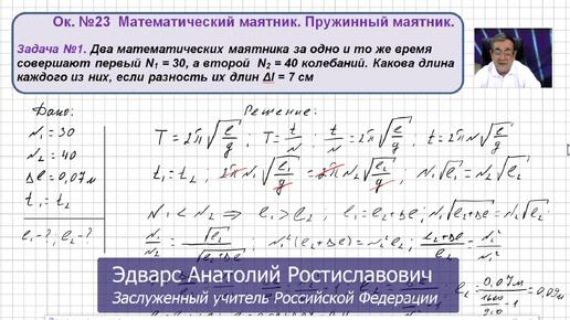 Физика09. Видео. ОК 023. Задача 1. Математический маятник. Два математических маятника за одно и то же время совершают первый N1 = 30 ...