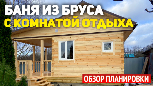 Проект одноэтажной бани из бруса 4х4 с террасой: комната отдыха, парная, помывочная