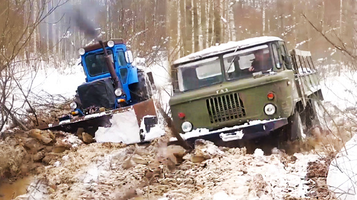 Тракторист поспорил с ГАЗ 66 на гиблой дороге. Трактор или военный грузовик на бездорожье.
