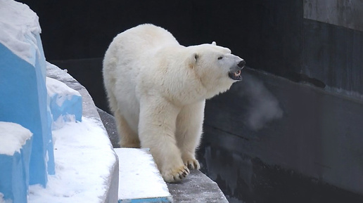 Белая медведица Герда красиво гуляет по вольеру, а Кай развлекает публику, играя с канистрой.