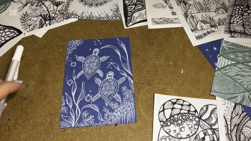 Если вы думаете, что не умеете рисовать, просто попробуйте это сделать вместе со мной. Морские черепашки и новые зентанглы на синем картоне