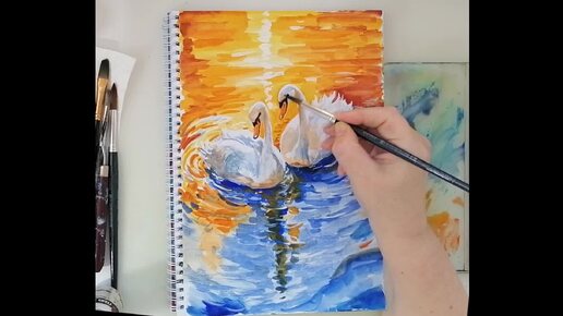 Мастер-класс. Показываю как нарисовать легко и быстро яркую картинку детской акварелью. Живопись. Лебеди.