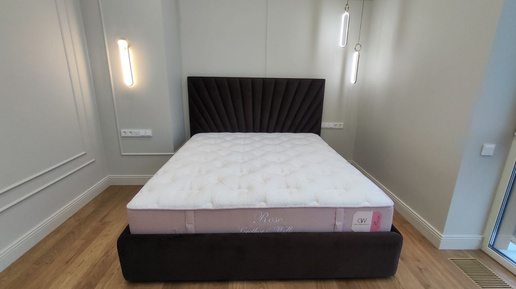 Роскошная мягкая кровать в интерьере комнаты. Инфинити
