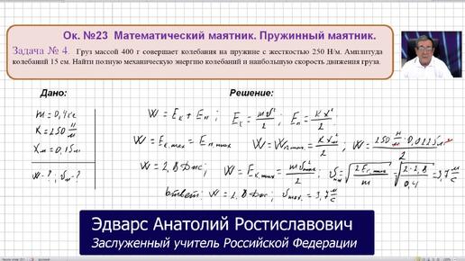 Физика09. Видео. ОК 023. Задача 4. Пружинный маятник. Груз массой 400 г совершает колебания на пружине с жесткостью 250 Н/м. Амплитуда ...