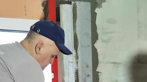 Как уголок с сеткой устанавливается на вертикальном оконном откосе, утепление откосов ЭППС, втапливание уголка в клей Baumit StarContact