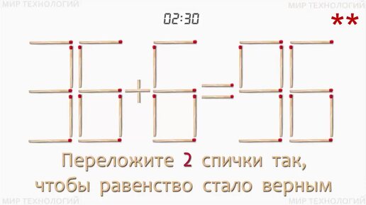 Задача со спичками 398 (3). Переложите 2 спички так, чтобы равенство стало верным (36+6=96).