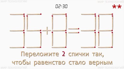 Задача со спичками 399 (3). Переложите 2 спички так, чтобы равенство стало верным (35+8=38).