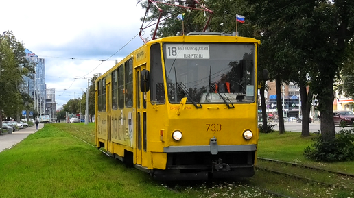 Трамвай Екатеринбурга Tatra T6В5SU СМЕ борт. №733 маршрут 18 следует по улице Челюскинцев