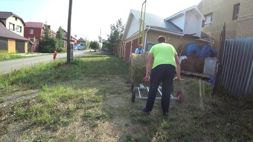 На тележке везем корове рулон сена