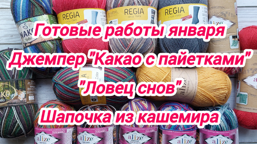 Готовые работы января Джемпер "Какао с пайетками " Панно "Ловец снов" Шапочка из кашемира Носочки Набор пряжи на футболку Вязальные желания