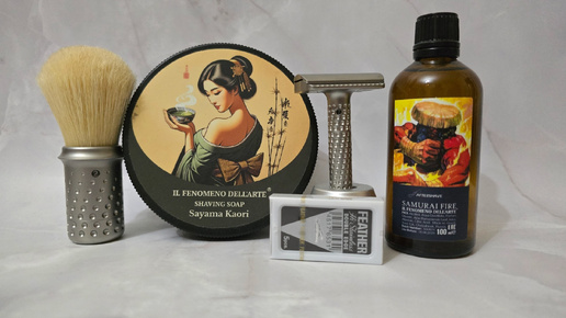 Регулируемая бритва и помазок Tatara Muramasa, мыло Sayama Kaori, а/ш Samurai Fire, лезвия Feahter
