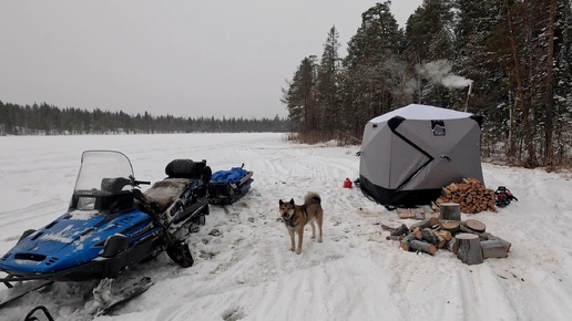 ЖИВЁМ В ЗИМНЕЙ ПАЛАТКЕ С ПЕЧЬЮ В ЛЮТЫЙ МОРОЗ. РЫБАЛКА НА СЕВЕРЕ. НОЧЁВКА В ПАЛАТКЕ КУБ НА ЛЬДУ. ПРОВЕРКА ЖЕРЛИЦ. ПОЙМАЛИ ЩУК.