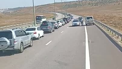 подъезд к Крымскому мосту с Керчи, очередь из легковых.
