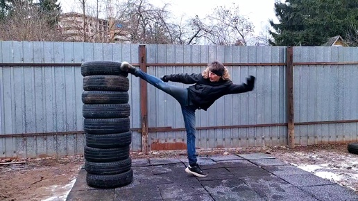 Связки ударов одной ногой. Быстро сбить две шины ударами одной ноги.