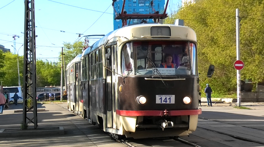 Трамвай Екатеринбурга Tatra T3SU борт. №141/142 маршрут 8 на остановке "Челюскинцев"