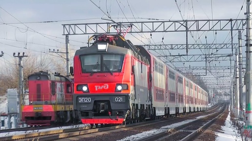 Электровоз ЭП20-021 с двухэтажным поездом и встречный электропоезд ЭС1П-043 "Ласточка".