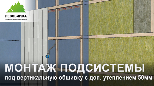 Монтаж подсистемы под вертикальную обшивку с дополнительным утеплением 50мм.