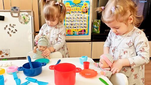 Аня и Арина ИГРАЮТ в куклы. ГОТОВЯТ кашу и суп, КОРМЯТ, ЗАБОТЯТСЯ, ГУЛЯЮТ вместе.