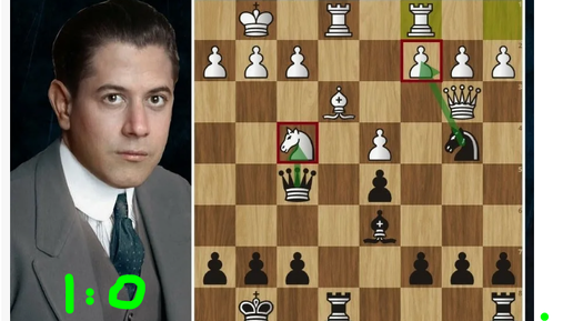Хосе Рауль Капабланка красиво делает победу своими белыми фигурами - убедительная победа над Карлом Гильгом в Карлсбаде, 1929, 1-0