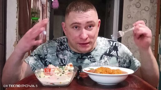 Мукбанг/обжор/тефтели в томатном соусе, овощной салат в майонезе/