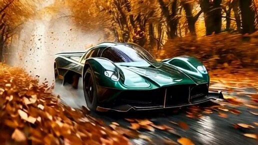 В движении, автомобиль чёрно-изумрудного цвета, листья взлетают в вихре после автомобиля в повороте.