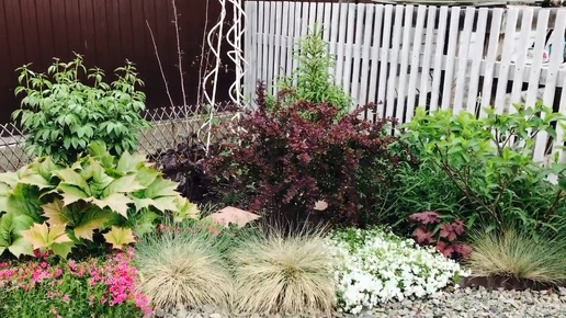 Миксы в ландшафте Уральского сада - десятки многолетних растений с названиями . Весна .