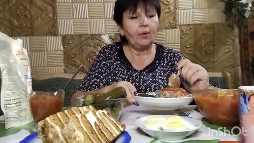Мукбанг. Гречка, котлета, отварное яйцо, аджика, квашеный огурец, лечо. Торт медовик с горячим чаем.😋👍