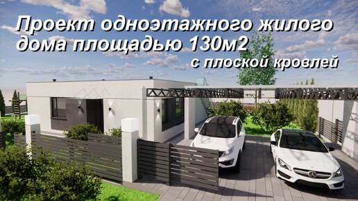 Проект одноэтажного дома на 130м2 с плоской кровлей. Большая кухня-гостиная, 3 спальни, 2 санузла, постирочная, топочная и гардеробная.