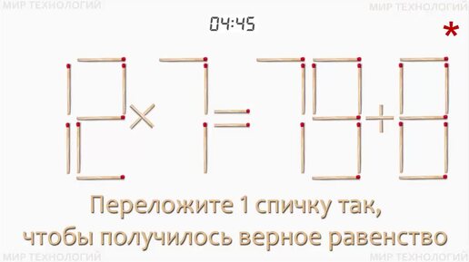 Задача со спичками 402 (2). Переложите 1 спичку так, чтобы получилось верное равенство (12 х 7 = 79 + 8).