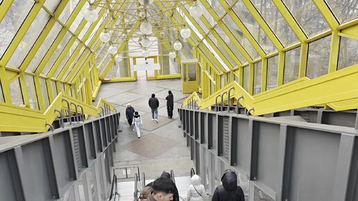 Обзор современного моста с лифтами и эскалаторами через Москву реку. Большой стеклянный мост, ведущий в парк Горького. Аномальная зима 2024