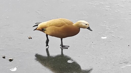 Зимний парк Горького в Москве. Зима без снега в столице. Утки гуляют по тонкому льду. Мало народу в парке в выходные дни. Утка мандаринка