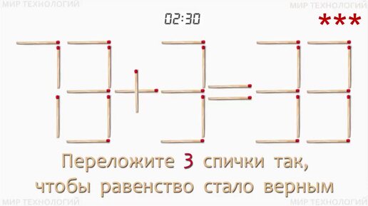 Задача со спичками 405 (4). Переложите 3 спички так, чтобы равенство стало верным (73+3=33)