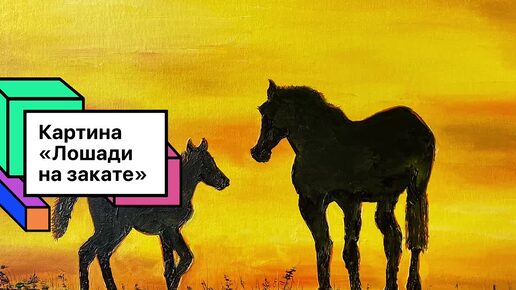 Картина маслом «Лошади на закате», холст на картоне, 25х35